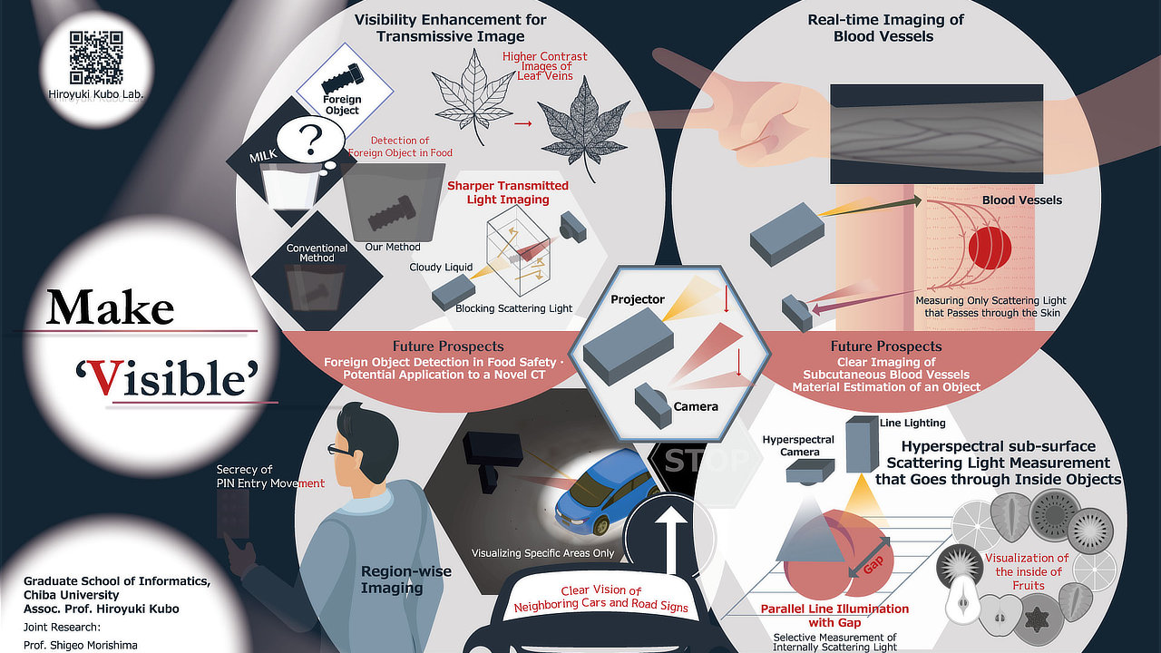 One outcome is a technique that enables real-time observation of blood vessels hidden beneath the skin. Normally, blood vessels under the skin cannot be seen with ordinary imaging, but by controlling a projector (illumination) and a camera, we can selectively capture only the light that passes through blood vessels and returns.
